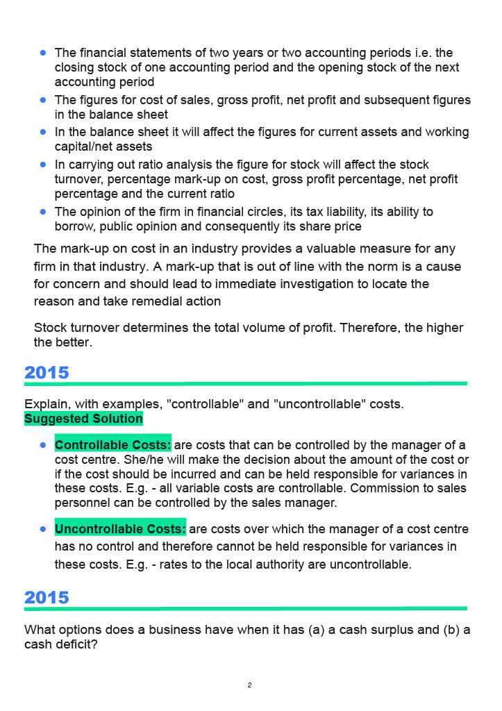 Key Lessons: Budgeting/Stock Valuation in Leaving Certificate Accounting The Prudence Concept in Stock Valuation: Closing stock should be valued at the lower of cost or net realizable value to ensure profits are not overstated, adhering to the prudence concept. This approach accounts for potential losses and ensures accurate financial reporting. The Importance of Budgeting: Regular budgets act as financial roadmaps, enhance staff communication, and help businesses efficiently allocate resources. Comparing budgets with actual performance highlights variances for corrective action. Impact of Incorrect Stock Valuation: Misvaluation of stock affects financial statements across two accounting periods, influencing gross and net profits, balance sheet figures, and key financial ratios, which can damage a business's reputation and financial standing. Controllable vs. Uncontrollable Costs: Managers can influence controllable costs (e.g., sales commissions), while uncontrollable costs (e.g., local authority rates) fall outside their control, emphasizing the need for tailored cost management strategies. Cash Budget Insights: Cash budgets forecast inflows and outflows, enabling businesses to plan for surpluses through investments or deficits via financing. This ensures sufficient funds for daily operations and strategic financial management.